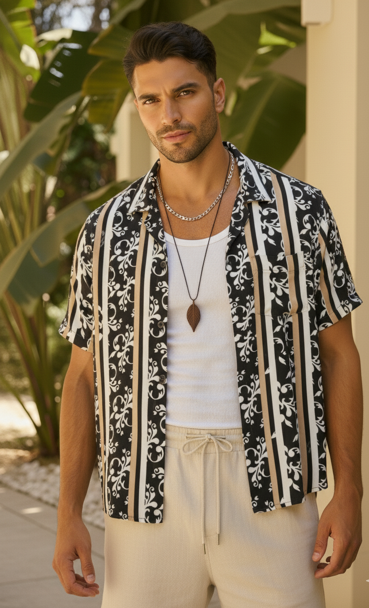 The Veyra Shirt is engineered for absolute comfort in the heat. This men’s casual shirt is crafted from a custom, lightweight blend of premium tencel and soft rayon. The fabric offers a beautiful, fluid drape and a soft-to-the-touch feel, making this the perfect short sleeve shirt to keep you cool all day long. Its classic camp collar (also known as a Cuban collar) and relaxed fit create the ideal silhouette for a laid-back, sophisticated men’s summer shirt.